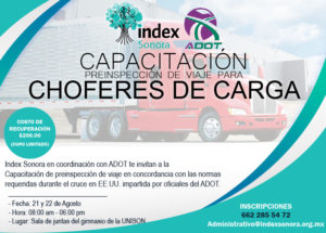 Index Sonora en coordinación con ADOT te invitan a la Capacitación de pre-inspección de viaje en concordancia con las normas requeridas durante el cruce de EE.UU. impartida por oficiales del ADOT. INSCRIPCIONES Teléfono: (662) 285 54 72 Correo: administrativo@indexsonora.org.mx